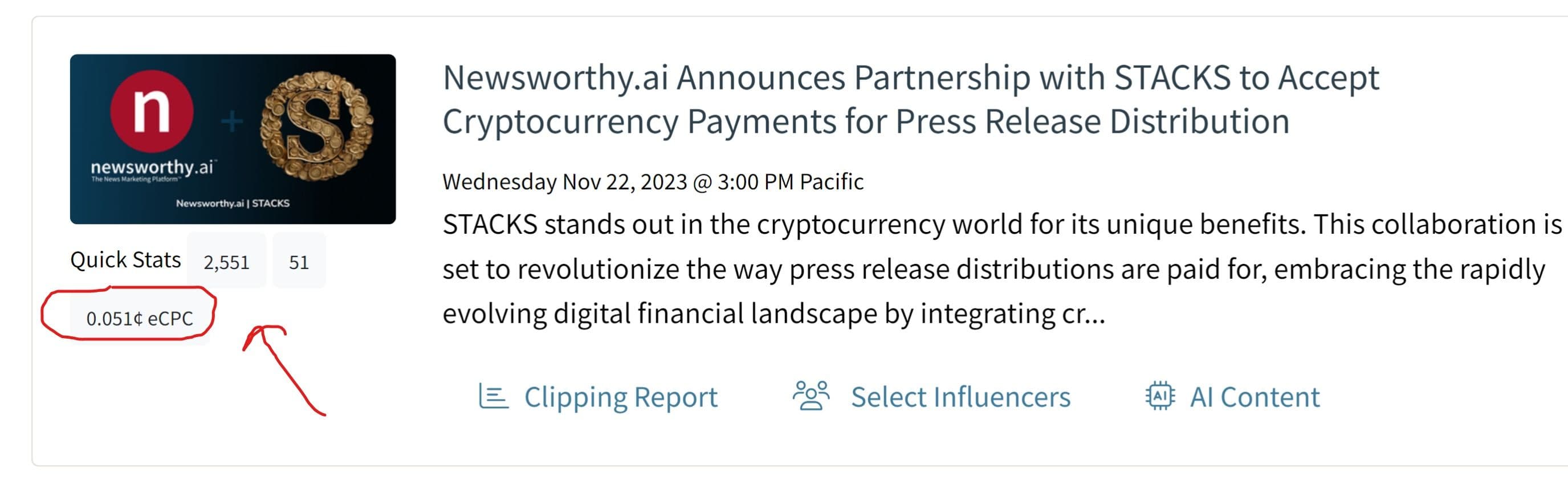 Engagement metrics are something that we can confidently report as accurate due to our proprietary Web3 Stack that allows us to provide trustworthy numbers for clicks on the headline (press release views). This also allows us to show an estimated cost-per-click (CPC) to help marketers better evaluate their press release effectiveness. Most press releases distributed through Newsworthy.ai achieve a CPC of between $0.025 and $0.50 (because the press release is a permanent fixture on the Internet, the CPC diminishes over time).