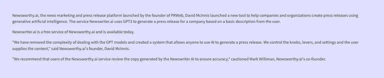 Let’s look at an example using Newsworthy.ai's AI press release writing tool, NewswriterAI — the first GPT-3 OpenAI powered generative AI press release writing tool introduced in February 2023.